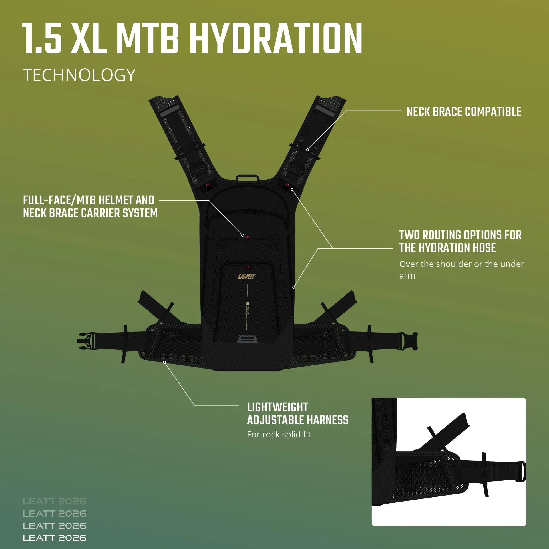 Hidratación de 1,5 L y carga de 20 L Arnés ajustable ligero y único para un ajuste sólido Listo para ajustar opcional Probado por la CE y certificado como protección contra impactos: Capa exterior ligera y duradera Funda para lluvia extraíble de alta visibilidad Bolsillo para gafas de polar "Silbato de emergencia" Tubo de hidratación doble para enrutamiento bidireccional: sobre el hombro o debajo del brazo Ventilación trasera AirLine óptima Válvula de mordida de vejiga con apagado automático El receptor de tubo magnético se puede colocar en el arnés izquierdo o derecho El parche ranurado reflectante permite la suspensión opcional de la luz de seguridad Ajuste optimizado con o sin un collarín Leatt® Tallas: Talla única - XS-XXL Embalaje reciclable sin plástico