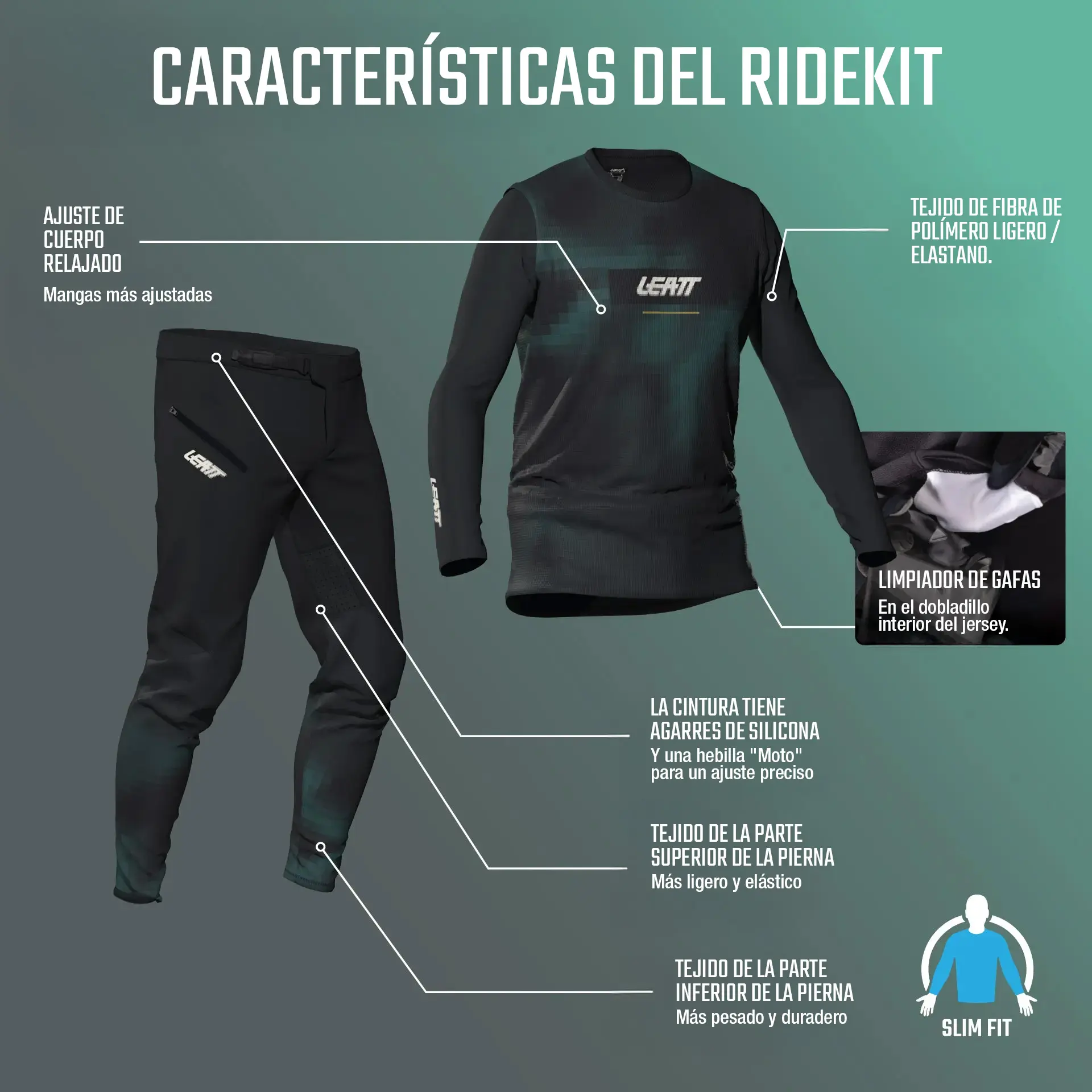 • Ajuste: Jersey con corte relajado en el cuerpo y mangas ajustadas • Pantalón con corte entallado moderno, espacio extra en la parte superior para protección • Cintura con silicona antideslizante y cierre tipo moto para ajuste preciso.