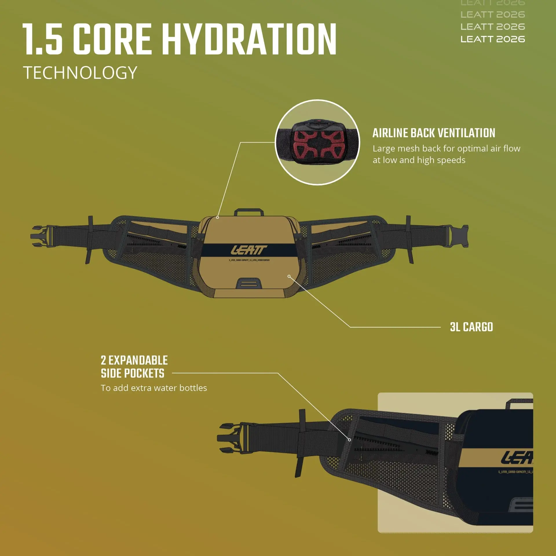 Sus 3.0 L de almacenamiento te darán suficiente espacio para lo esencial, con bolsillos adicionales en el cinturón.